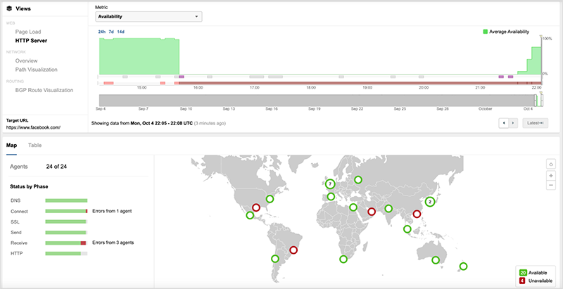 We were previously told that NETSCOUT felt a BGP routing issue was the cause of this outageWe are now being told that this BGP Routing issues was not related to the outage. Just before Facebooks outage Graham-Cunning said CloudFlare detected a large number of BGP changes mostly route withdrawals to Facebooks autonomous systems - basically the local post. 6 3 BGP routing was restored for the affected prefixes at about 2050 and DNS services began to be available again at 2105 UTC but application-layer services were slowly being restored to Facebook Instagram and WhatsApp. With no BGP routes into Facebooks network Facebooks own DNS servers would be unreachable -- as would the missing application servers for Facebook-owned Instagram WhatsApp and Oculus VR.